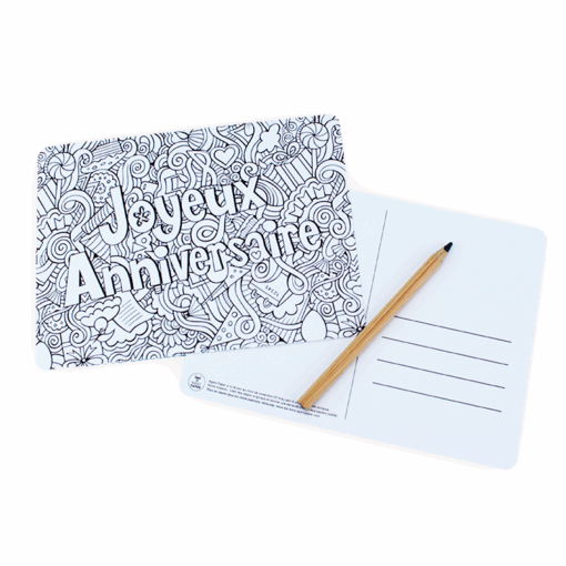 Avec cette carte à colorier, en plus d’envoyer de vos nouvelles, vos permettez au destinataire de s’amuser en coloriant la face (et du coup, celui-ci risque de ne pas lire ce que vous lui avez envoyé).