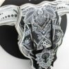 Cette reproduction en carton noir de la tête de bison en bois a un aspect plus ténébreux en carton noir. Avec ses lignes blanches accentuant le côté squelettique, on pourrait croire à une figurine toute droit sortie du jour des morts mexicain.