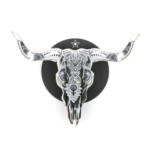Cette reproduction en carton noir de la tête de bison en bois a un aspect plus ténébreux en carton noir. Avec ses lignes blanches accentuant le côté squelettique, on pourrait croire à une figurine toute droit sortie du jour des morts mexicain.