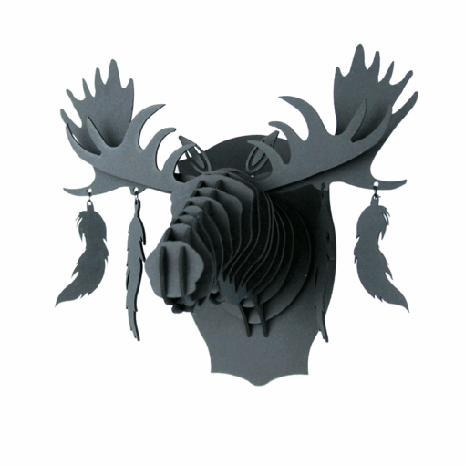 Cet élan en carton noir est le même que son cousin l’élan en bois, sauf qu’il est plus petit et qu’il est gothique. Dans un esprit d’anticonformisme, il a décidé de s’habiller entièrement en noir pour se démarquer de tous ses congénères. Il sera aussi bien à son aise dans des pièces aux tons sombres, ou très très claires pour qu’il puisse détoner avec le décor.